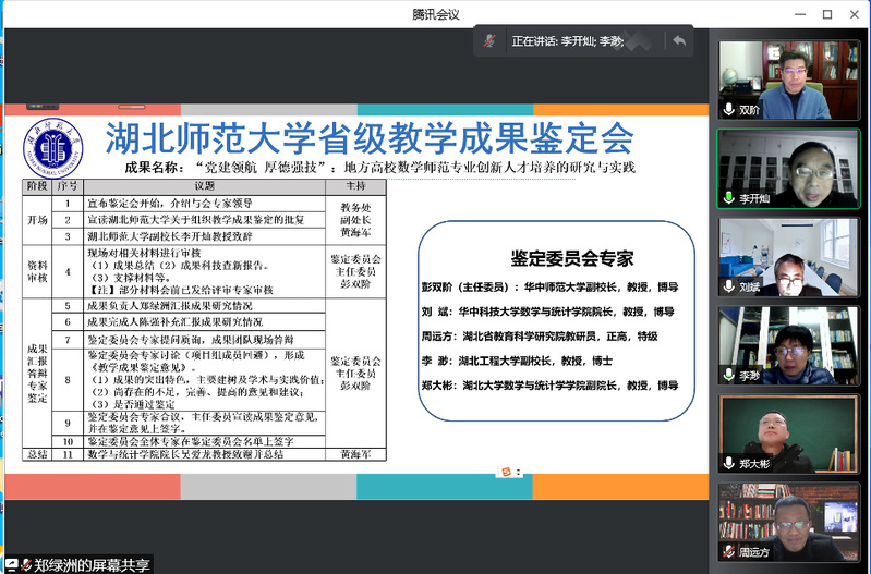 2月16日,5楼自拍 申报第九届湖北省教学成果奖成果鉴定会在线上举行。鉴定委员会委员由华中师范大学副校长彭双阶教授(主任委员)、华中科技大学5楼自拍 院长刘斌教授、湖北工程大学副校长李渺教授、湖北省教育科学研究院周远方教授(正高、特级)、湖北大学数学与统计学学院副院长郑大彬教授等5位专家组成。鉴定会由教务处副处长黄海军主持,5楼自拍 党委常委李开灿教授致欢迎辞,成果全体完成人参加会议。