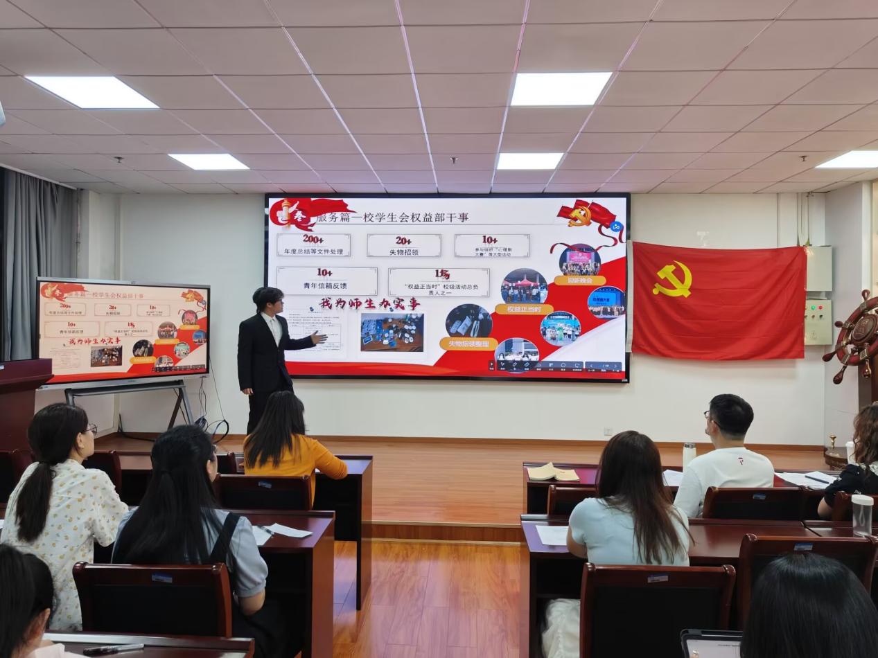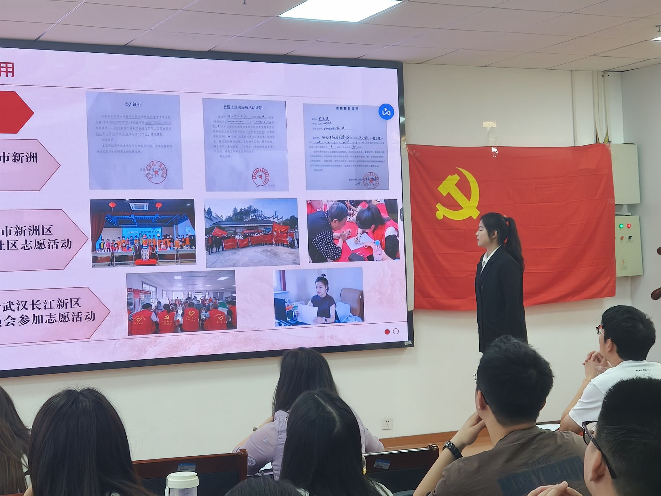 本次发展对象评选以现场答辩形式进行,包含自我汇报、现场评议和支委讨论环节。符合条件的入党积极分子通过PPT,从思想品德、学习情况、社会实践和服务能力四个方面进行展示。答辩过程中,党员就汇报内容进行现场提问,答辩人员根据问题进行补充说明。