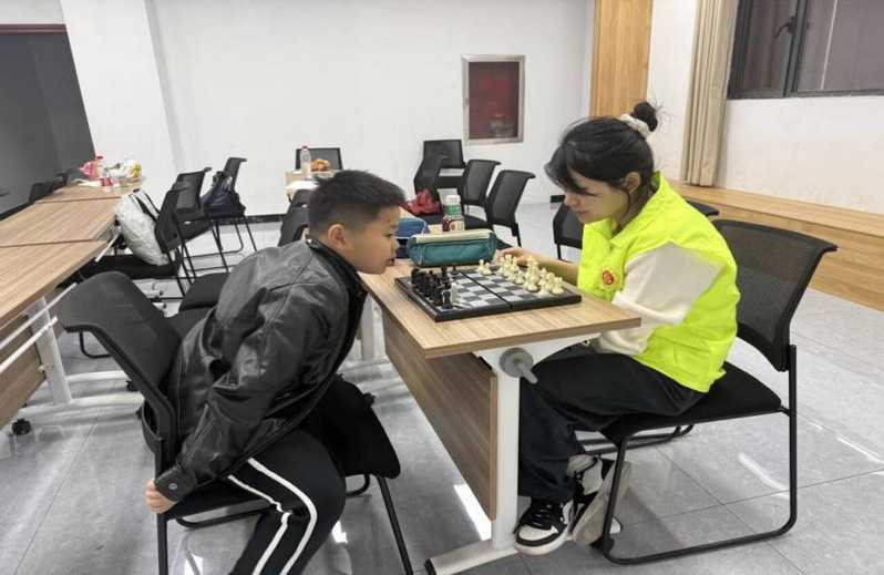 图为志愿者与孩子下国际象棋