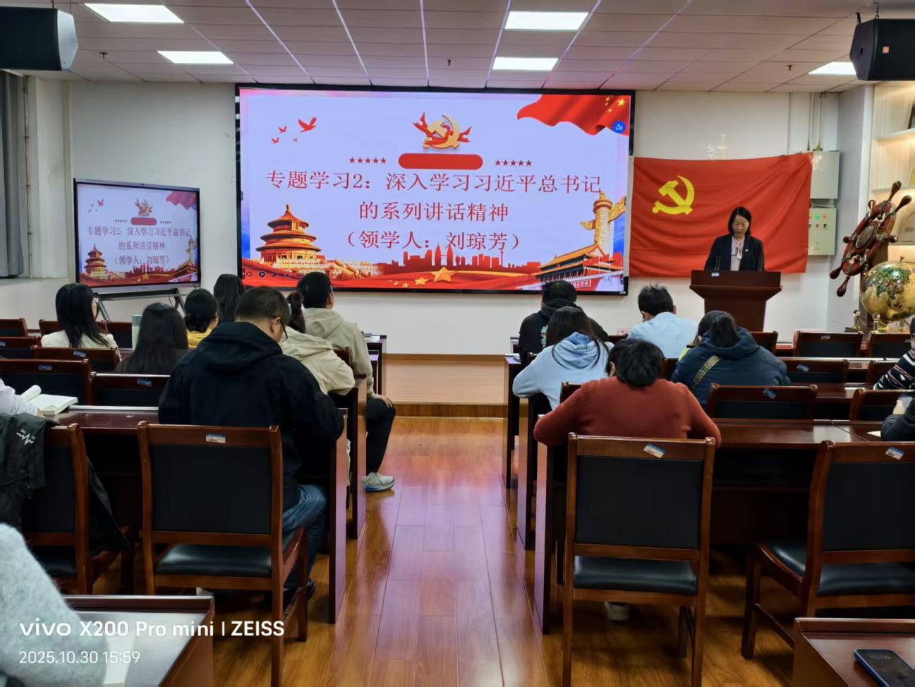 活动中,全体党员完成了交纳党费、重温入党誓词和集体诵读党章学习。本次活动的微党课环节专题学习1由学院党委副书记袁曼同志带领全体党员深入学习习近平新时代中国特色社会主义思想,学习《习近平谈治国理政》第五卷等著作。专题学习2由学院党委书记刘琼芳同志领学《中国共产党思想政治工作条例》,及时跟进学习习近平总书记最新重要讲话和重要指示批示精神。