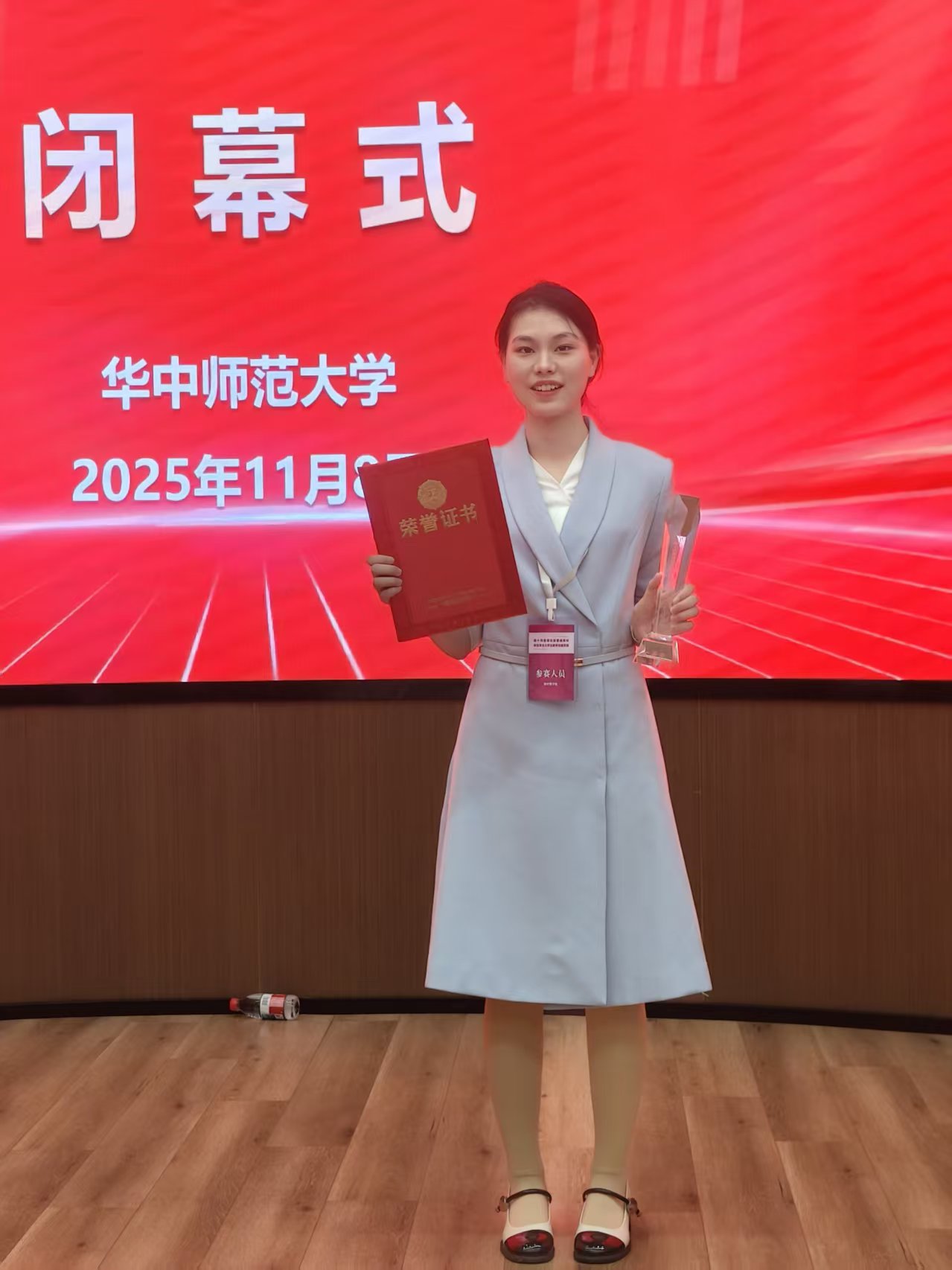 2025年11月8日,湖北省普通高校师范专业大学生教学技能竞赛决赛传来捷报——5楼自拍 23级2301班夏颍慧同学代表学校出征数学组赛事,凭借扎实的教学功底与出色的现场表现,勇夺省级一等奖!