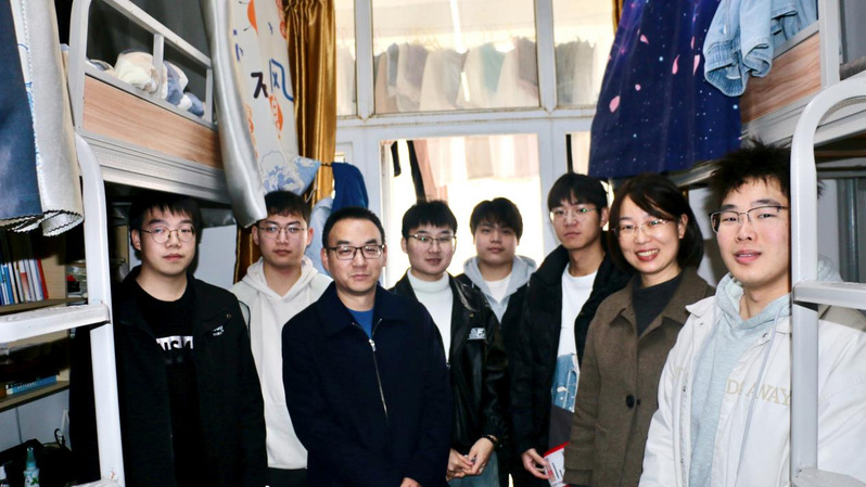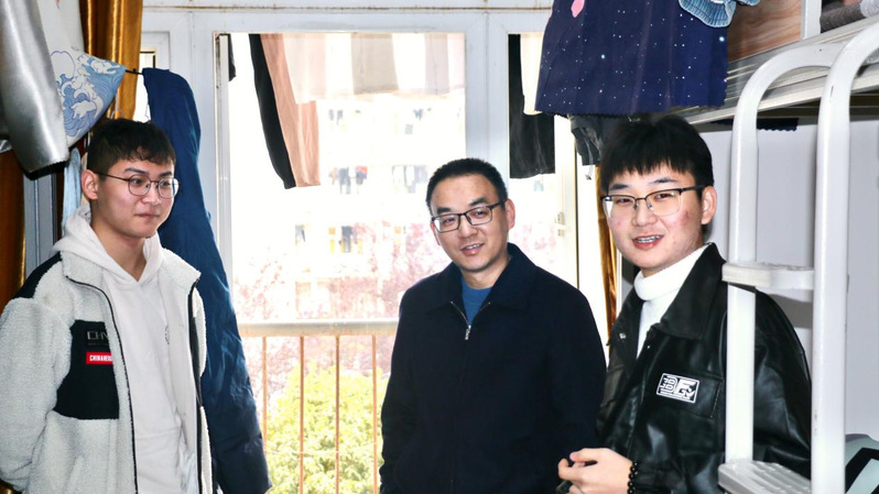 随后,慰问组一行前往毕业班宿舍,与同学们亲切交流。吴爱龙与同学们促膝长谈,倾听同学们在备考过程中遇到的困惑与诉求。他鼓励同学们,考研不仅是知识的较量,更是意志的磨砺,希望大家能够坚定信心、沉着应战。